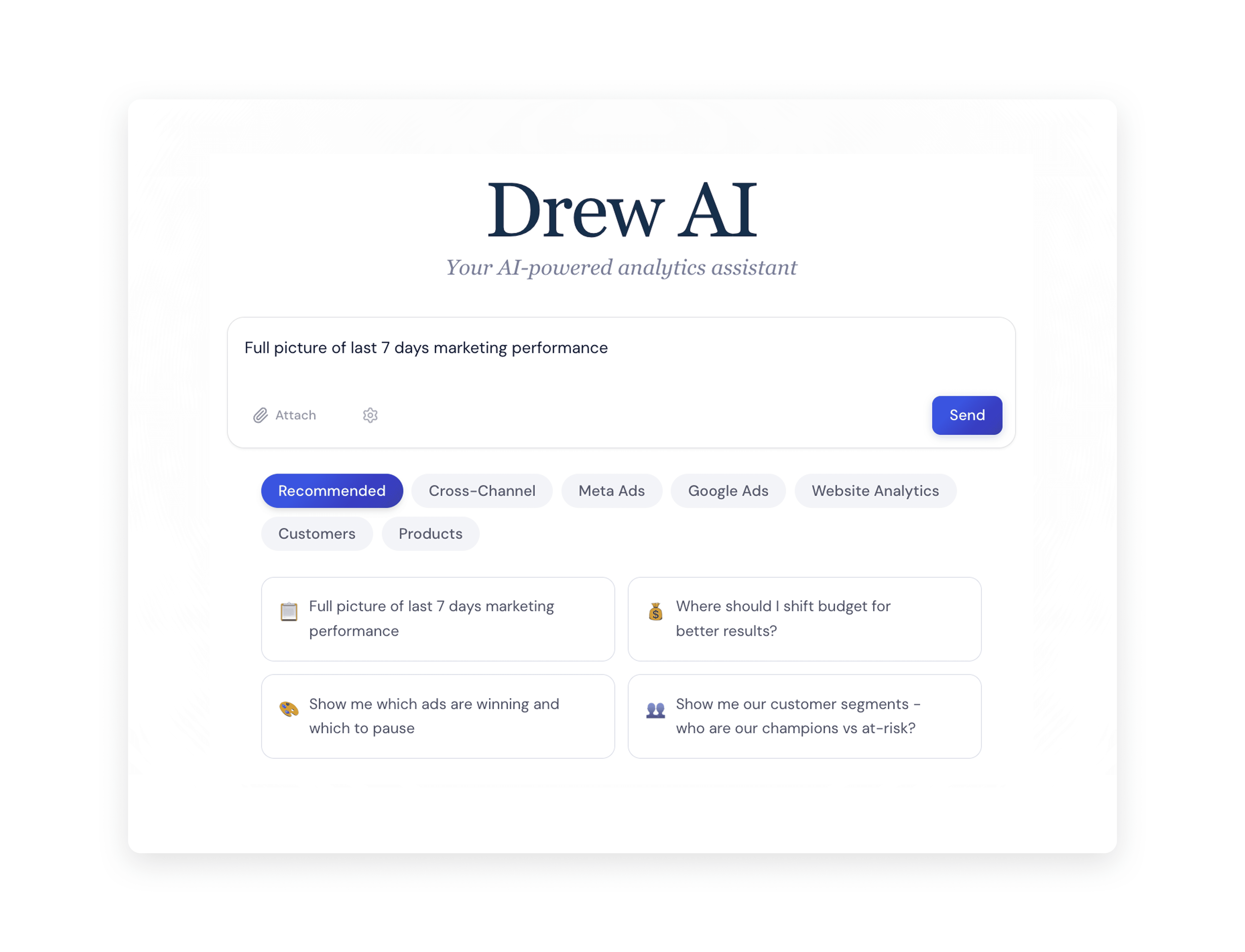 Ask simple questions. Drew handles the analysis, charts, and recommendations